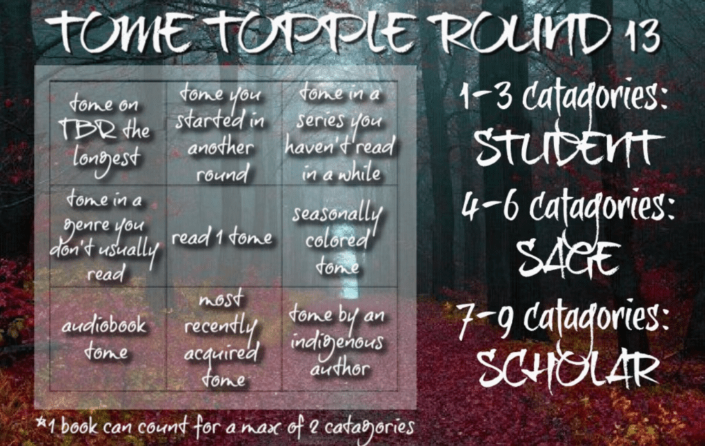 Are you participating in this round of Tome Topple? If so, let me know what is on your TBR! Or what you thought of any of the books on my TBR if you’ve read them!